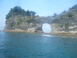 これは円月島という島ですが、波でこんな形に穴が開いたらしいです。